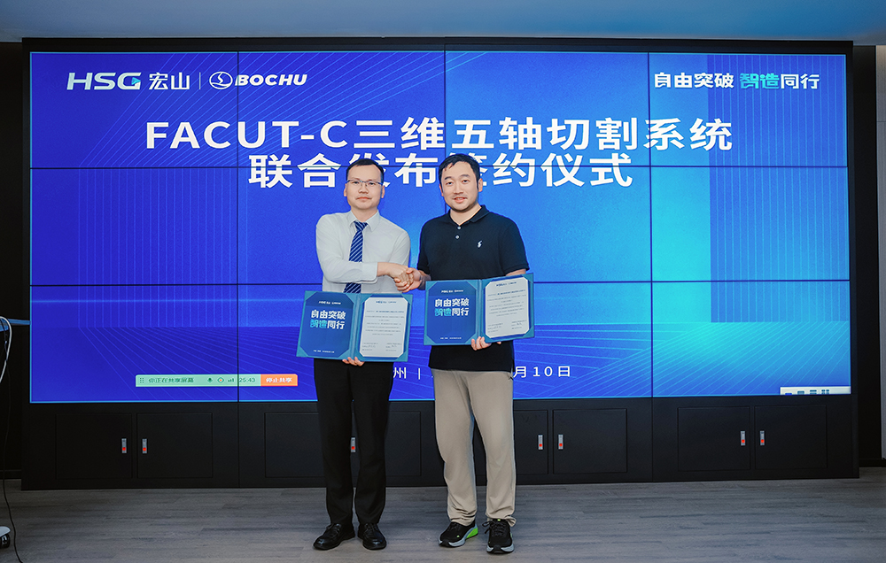 6月10日,宏山激光長三角總部蘇州基地迎來高光時刻——宏山激光攜手上海柏楚電子科技股份有限公司,聯(lián)合發(fā)布FACut-C三維五軸激光切割系統(tǒng),標志著雙方在高端激光裝備與運動控制系統(tǒng)領域的深度合作取得了階段性成果,也代表國產(chǎn)三維五軸系統(tǒng)在“自主可控、系統(tǒng)集成、平臺化發(fā)展”路徑上實現(xiàn)關鍵性突破。